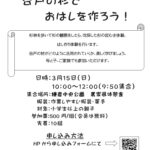 11月30日(日) 秋の谷戸まつりを開催しました。紅葉が美しい中、谷戸の収穫物をたくさんの方に味わっていただきました。 炊きたての新米のおにぎりともち、ふかし芋、谷戸鍋を販売しました。あっという間に完売となりました。 正月飾り作り、わたくり体験、竹箸作り、竹コップづくりなど体験コーナーも賑わいました。 […]